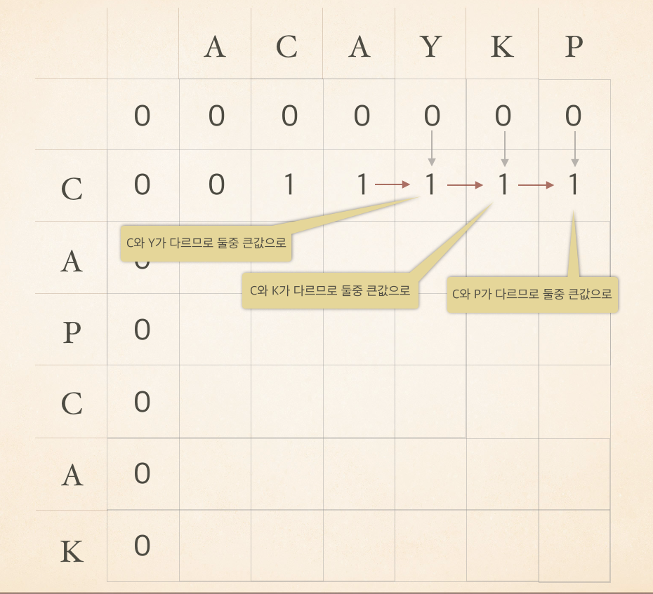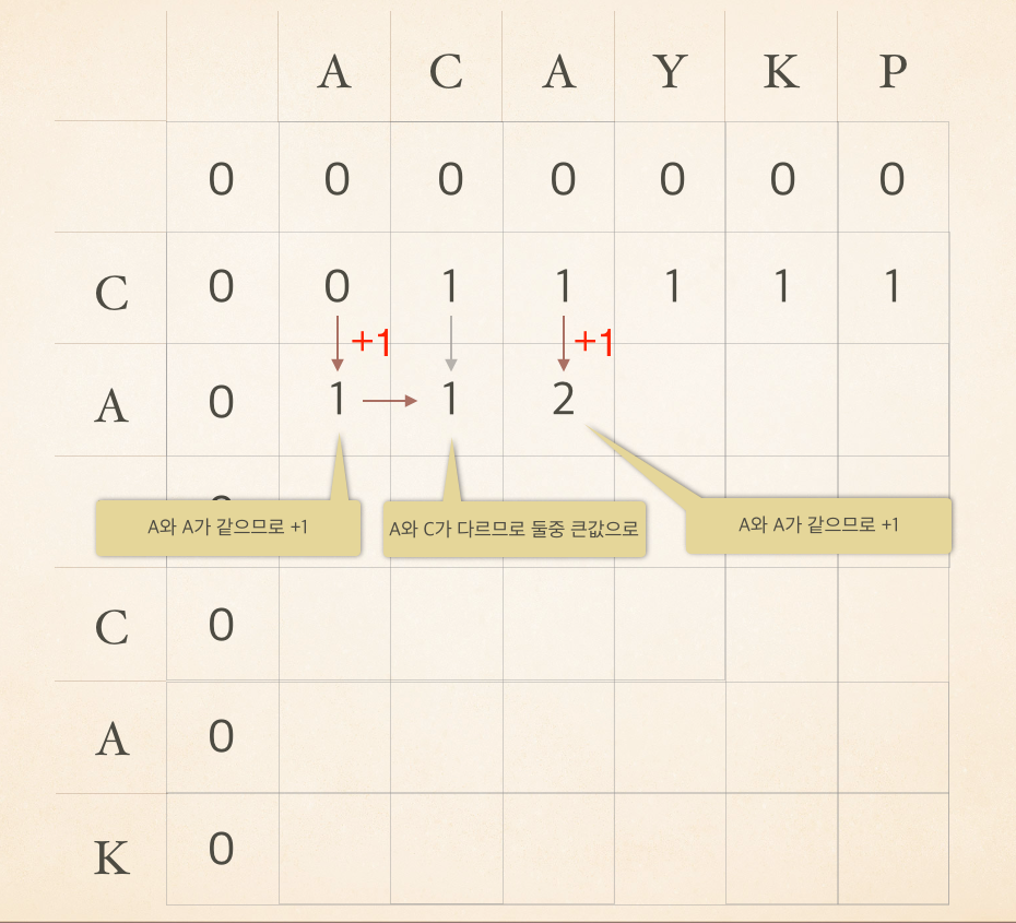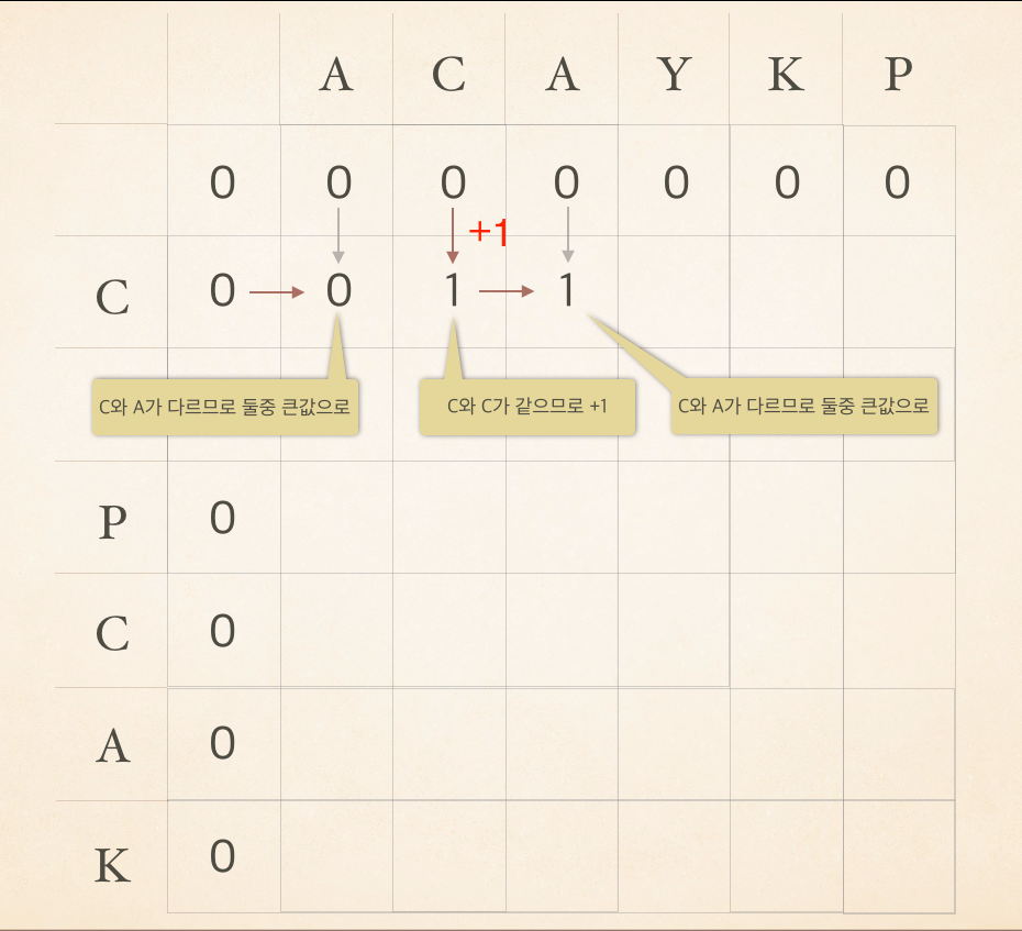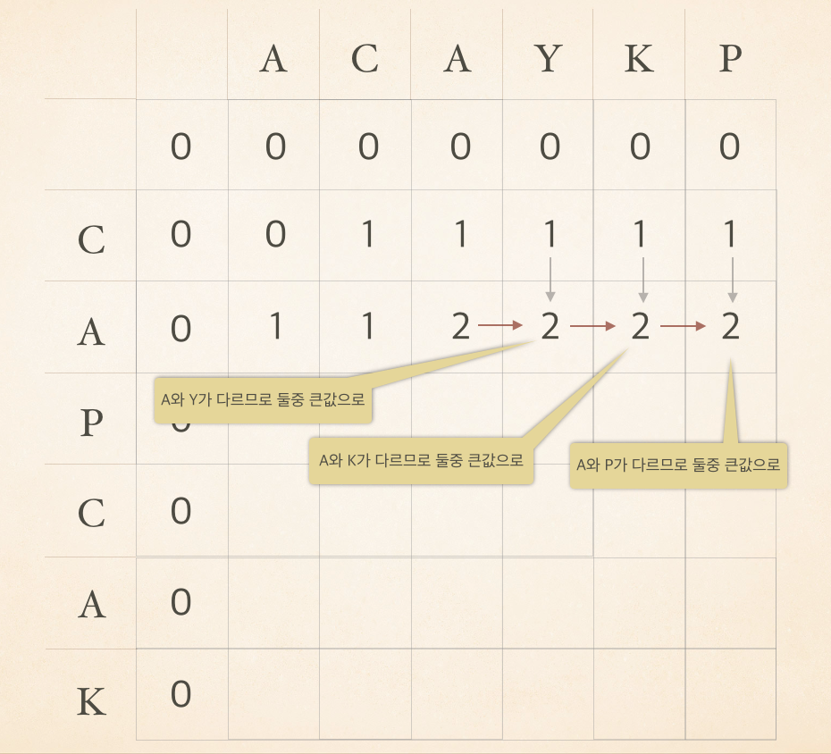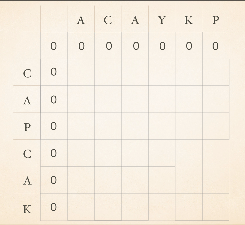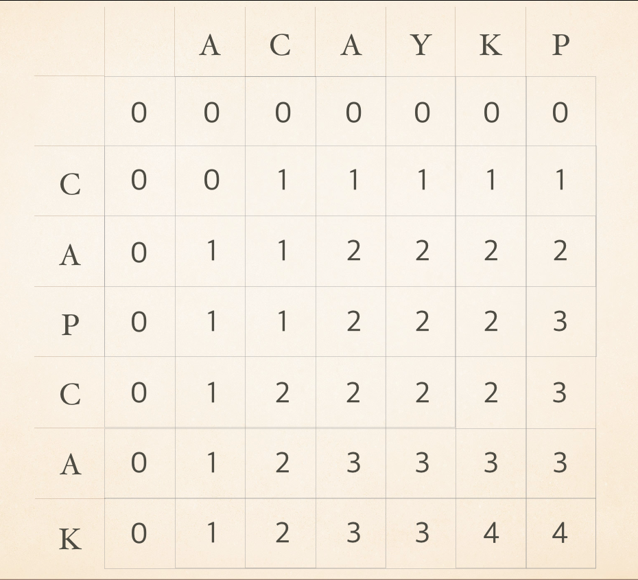 이 LCS를 구하기 위해서 대표적으로 사용되는 예인 ACAYKP 와 CAPCAK 로 살펴보자.