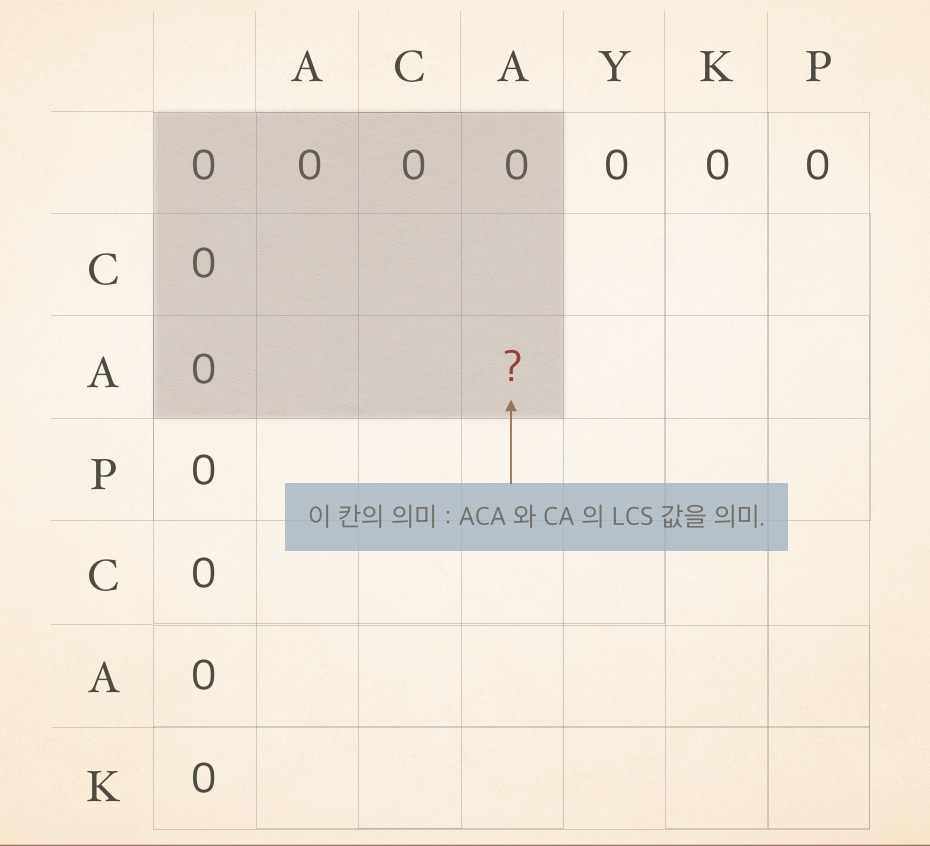 맨 첫칸부터 (0,0) 이라하면 ? 가 있는 부분은 (2,3) 이고 (2,3)의 의미는 첫번째문자열("ACAYKP") 에서 3번째 문자열까지("ACA"), 두번째문자열("CAPCAK")에서 2번째 문자열("CA")까지 중 LCS값을 의미한다.