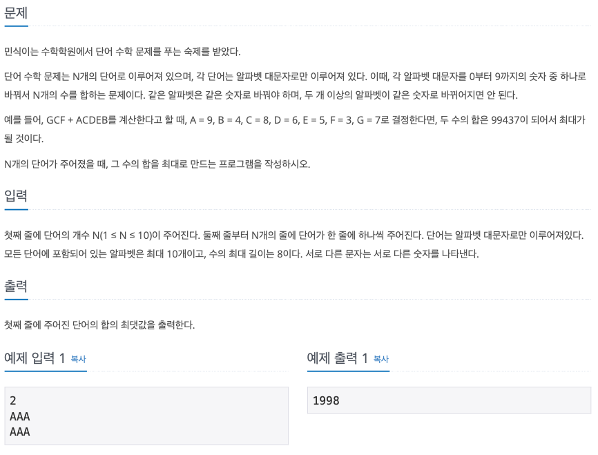 따라서 단어들이 주어졌을 때 각각의 알파벳들이 가지는 영향력의 크기들을 모두 더해서 배열에 저장해놓은뒤 그 영향력이 가장 큰 순서대로 9,8,7,6... 을 배정해주고 그 최종 합을 구해주면 그 답이 수의 합을 최대로 만드는 숫자가 될것이다.