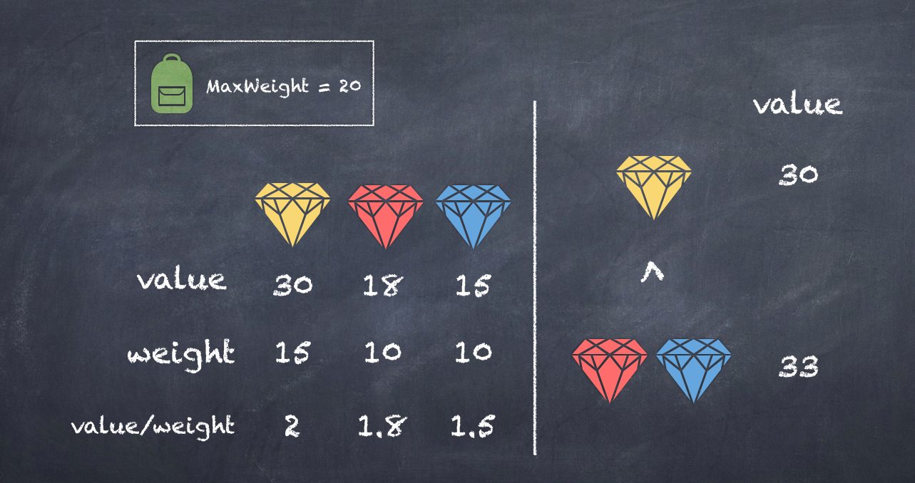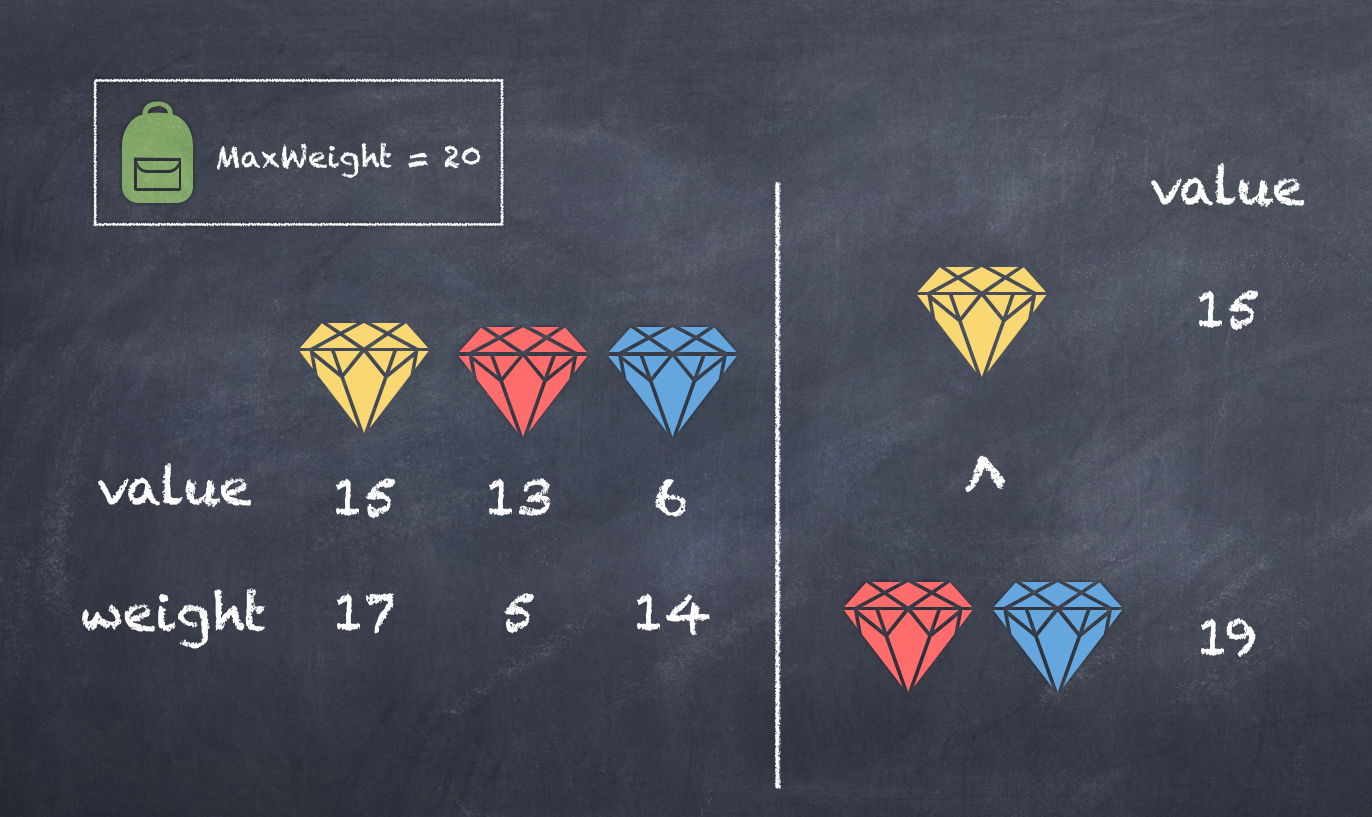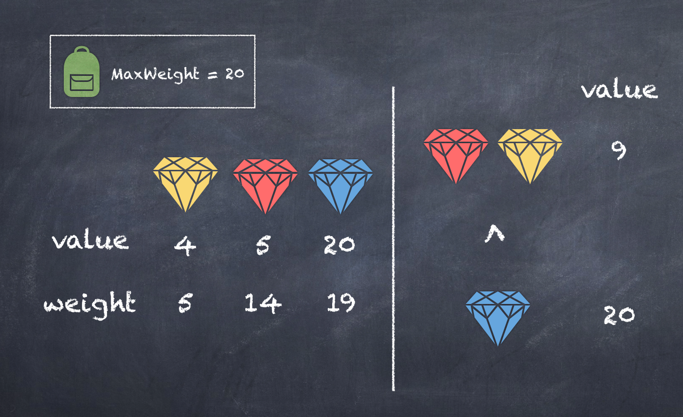 아래의 경우처럼 가장 효율이 좋은 물건 하나보다 효율이 좀 떨어지는 물건 두개를 고르는것이 더큰 가치가 만들어질수 있다.
