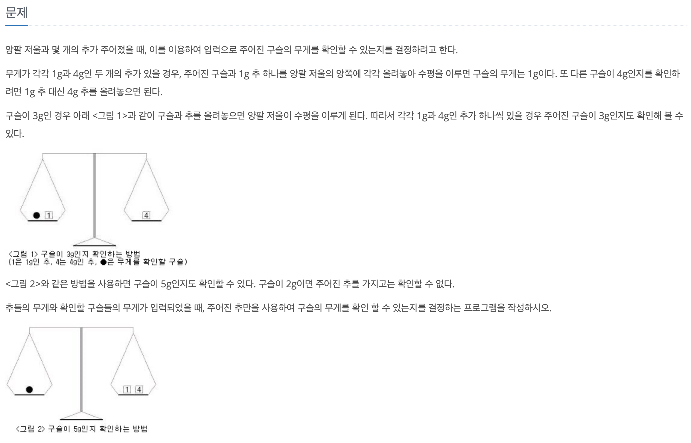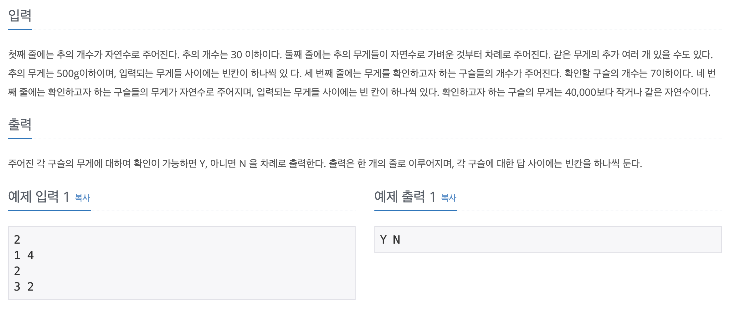 이 문제에서 헷갈릴수 있는 부분은 주어진 추들을 모두 사용할 필요가 없다는 것이다.