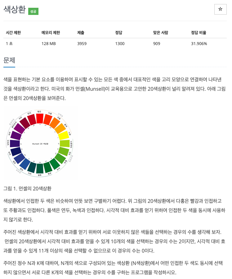 문제에서는 다채로운 색이 등장하지만 단순하게 n등분 되어있는 원에서 인접하지않게 k개를 색칠하는 경우의 수를 구하는 문제이다.