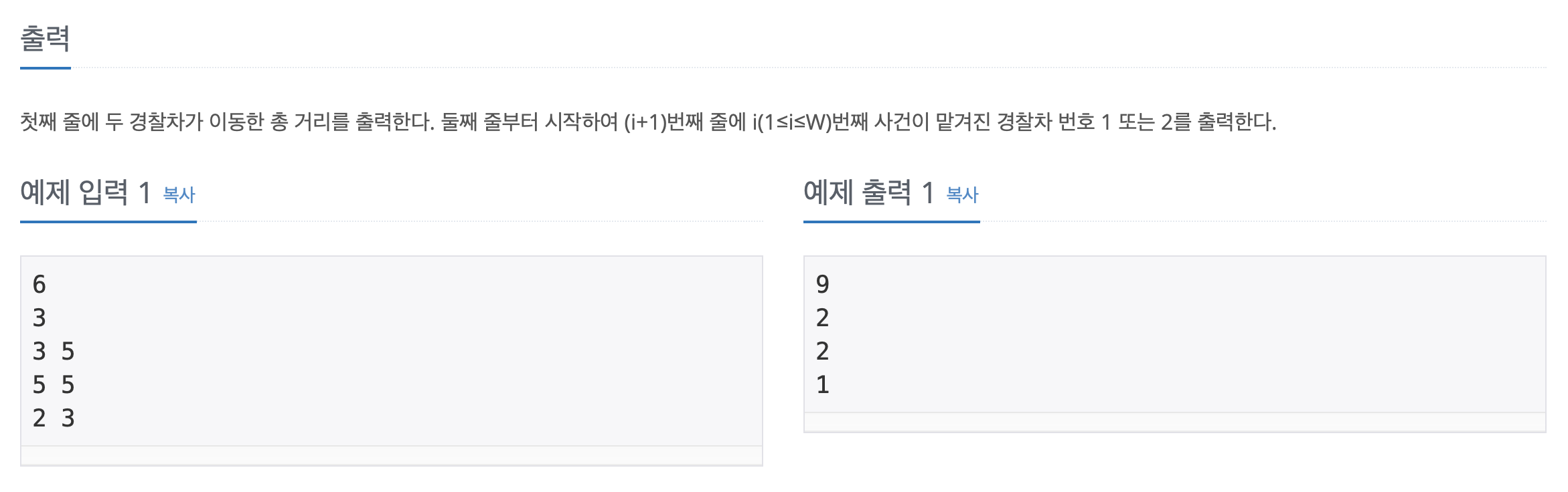 경찰차 문제는 (1,1), (n,n) 에 위치한 경찰차 두대가 w개의 사건들을 가장 짧은 거리를 이동하여 처리하는 문제이다.