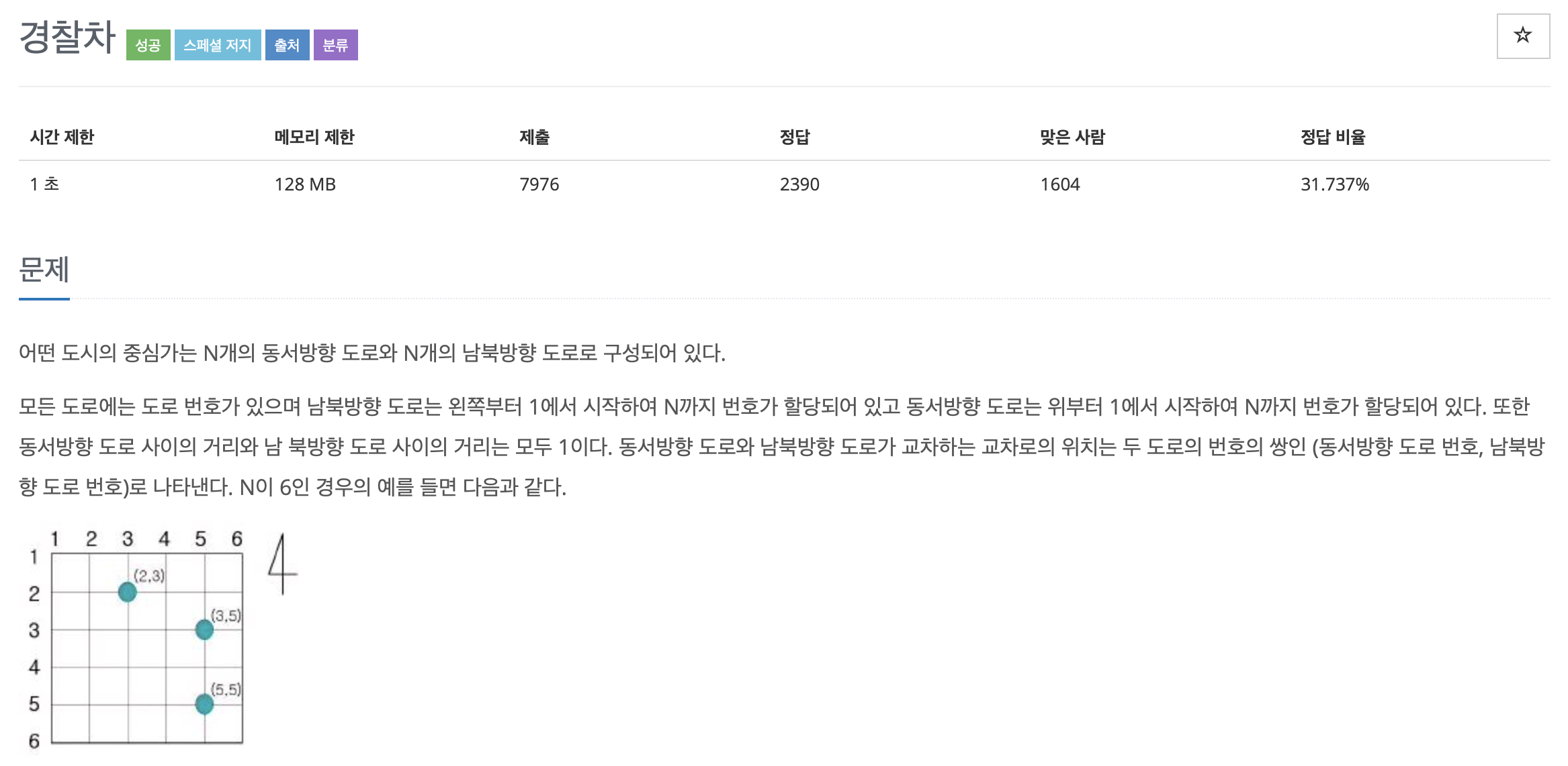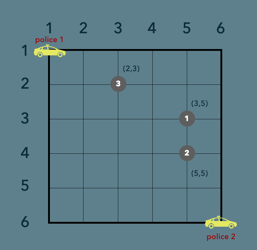 경찰차는 (1,1) 그리고 (6,6)에 위치해있고 3개의 사건이 분포되어있다.
