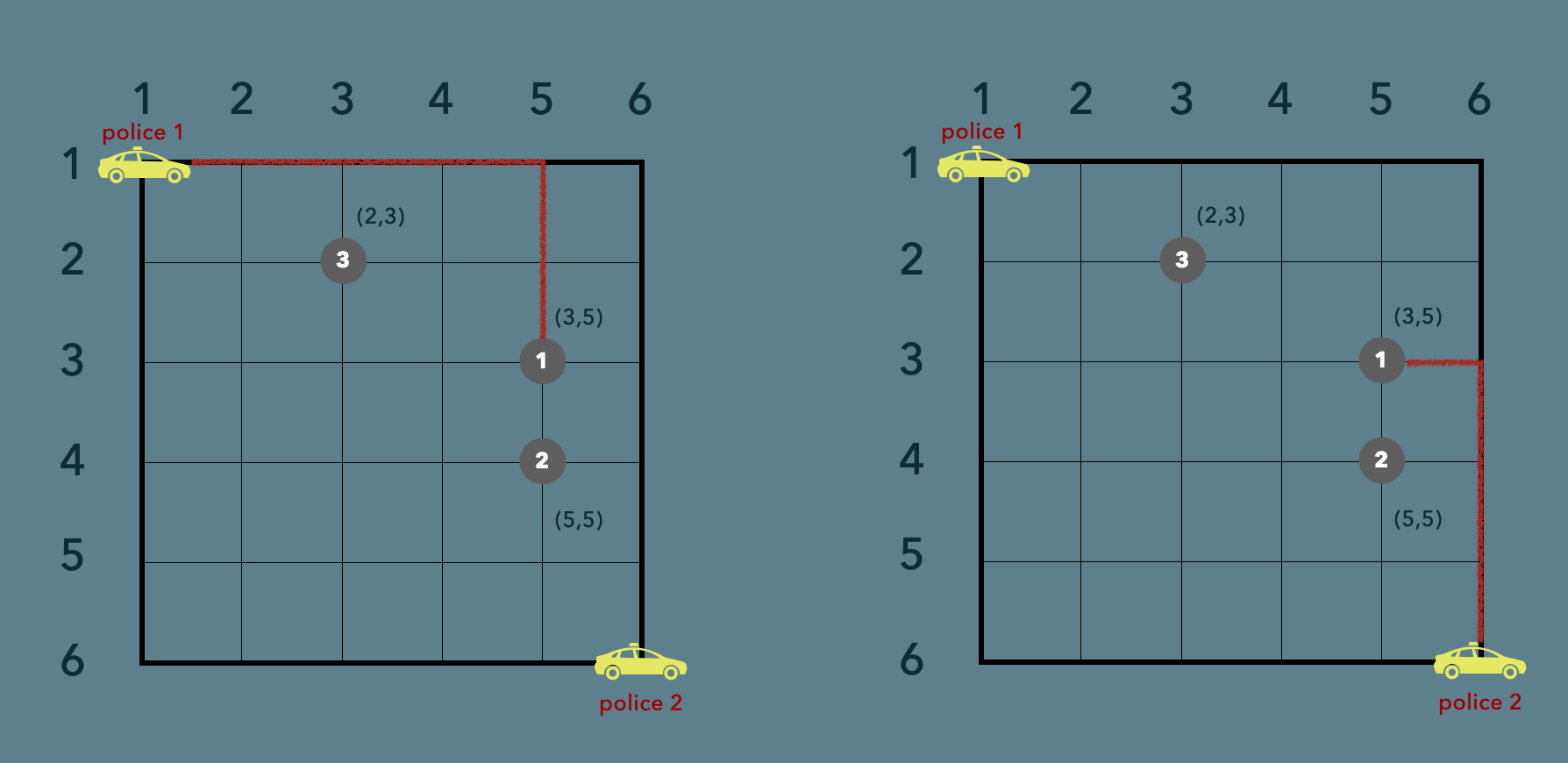 위와같이 1번 경찰차가 6칸을 이동하여 1번 사건을 처리할수도 있고,