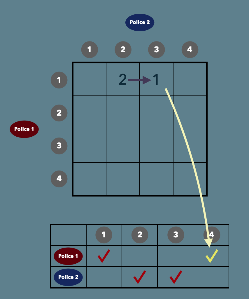 그리고 3번 사건을 2번경찰차가 담당한 후 4번째 사건을 담당해야 할 경찰차의 번호가 (1,3) 지점에 들어가야한다.