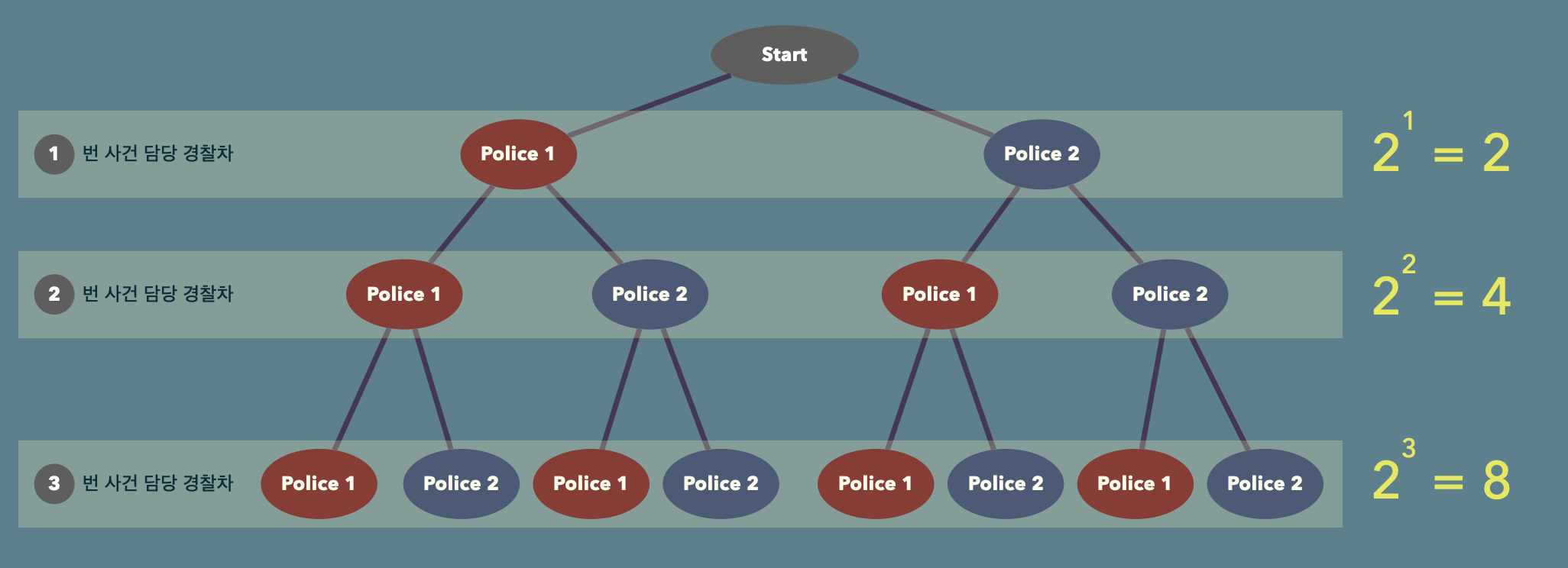 따라서 w개의 사건이 있다면 총 2^w 개 만큼의 경우의 수가 생긴다.