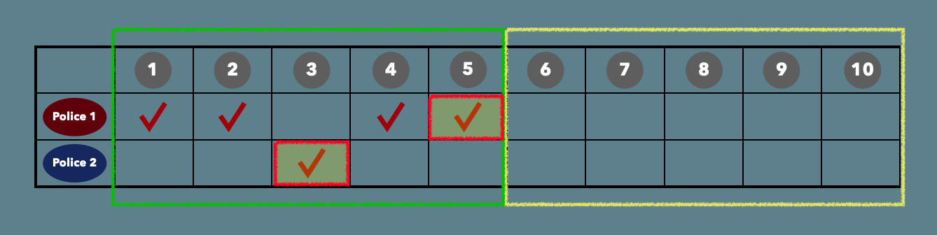 위와같은 경우 1,2,4,5 번사건을 1번 경찰차가, 3번 사건을 2번 경찰차가 담당하였다.