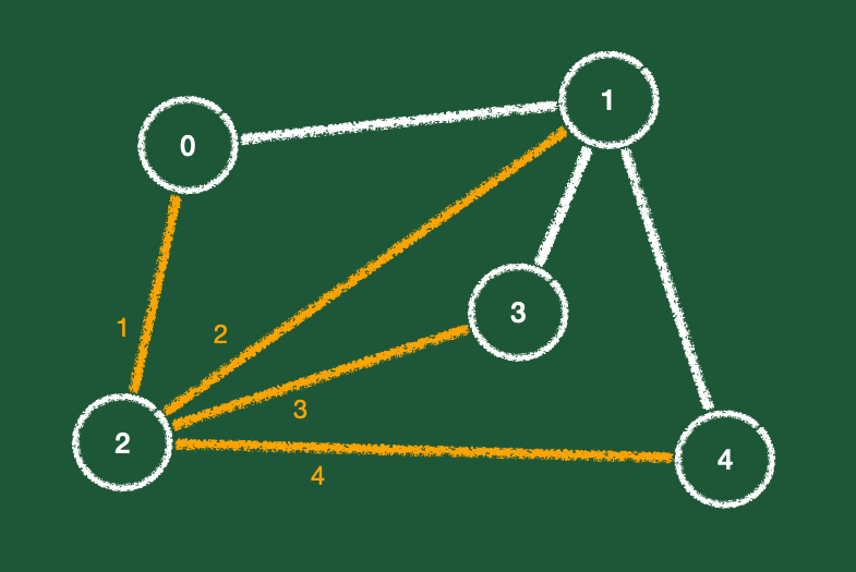 각 정점마다 간선의 수가 짝수여야한다는 의미는 위의 그림처럼 2번 정점에서 뻗어나간 간선이 4개인것 처럼 모든 정점에 대해 뻗어나간 간선들의 개수가 짝수개여야 한다는것이다.