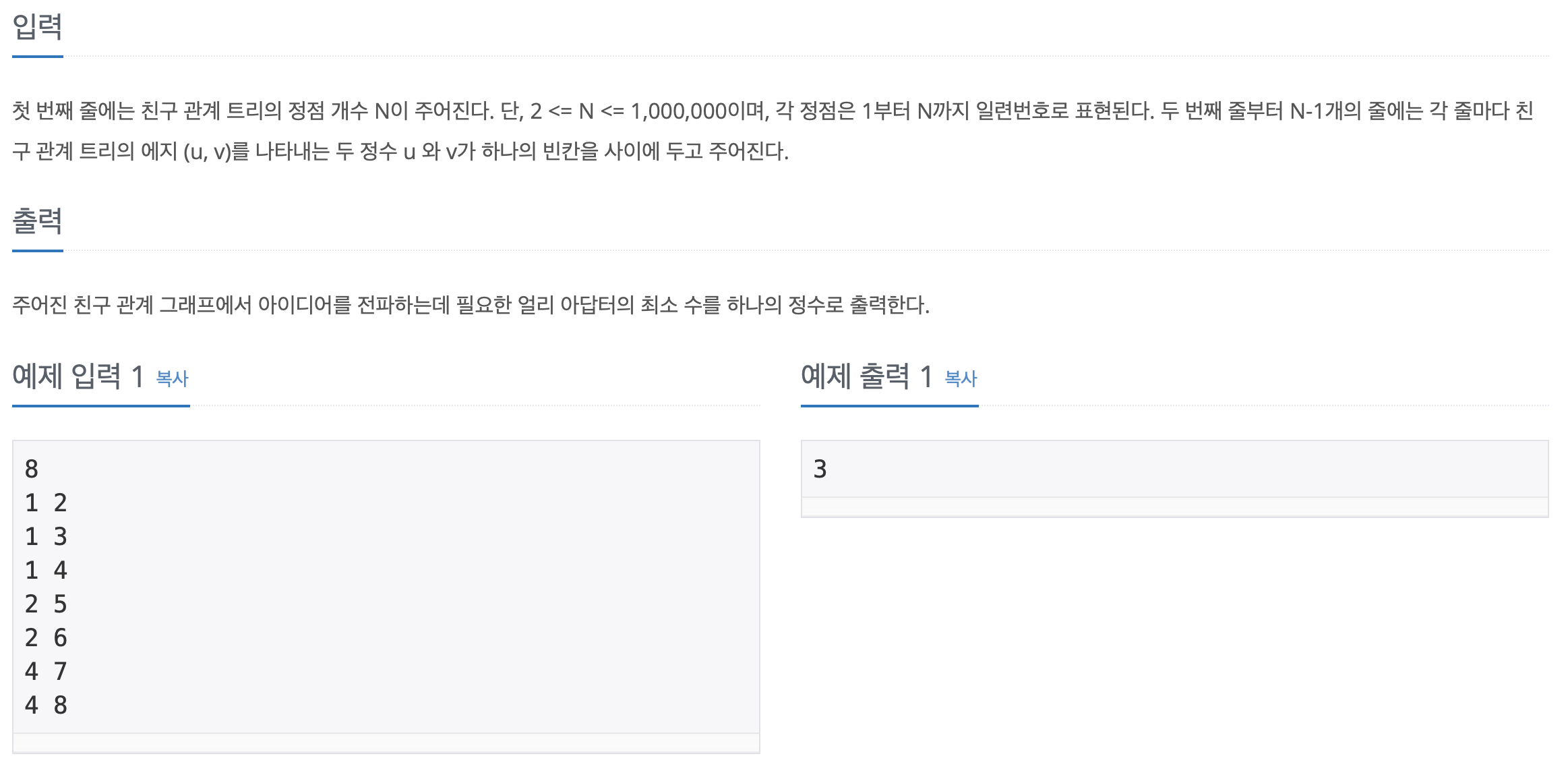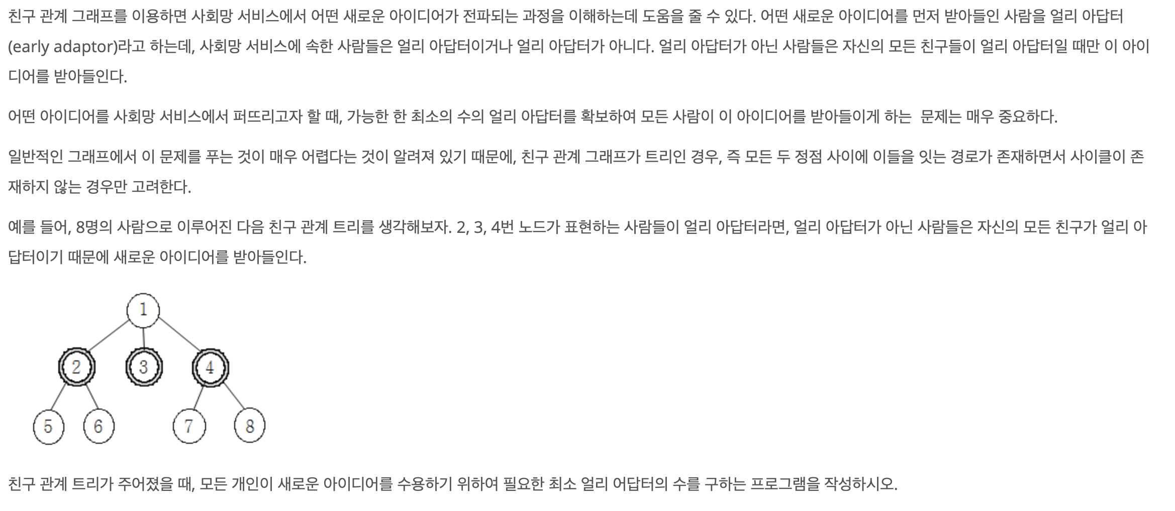 따라서 이것을 이용해 한정점에서 시작해 DFS로 순회하면서 위의 조건을 통해 최소의 얼리어답터 수를 구할 수 있을것이다.