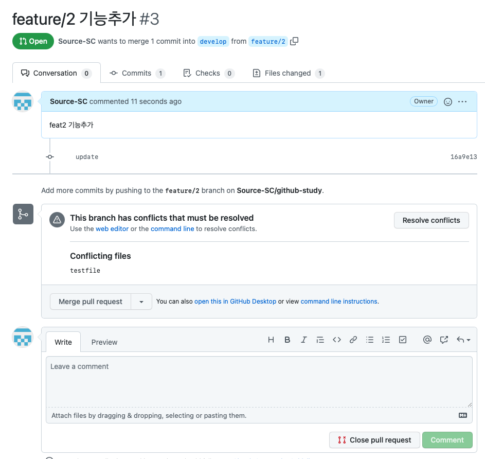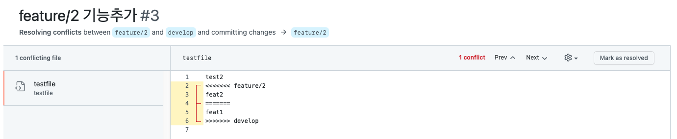 여기서 conflict 가 발생하므로 해당 부분을 적절히 수정해준다.(feat1, feat2 가 모두 포함되어야 할것이다)