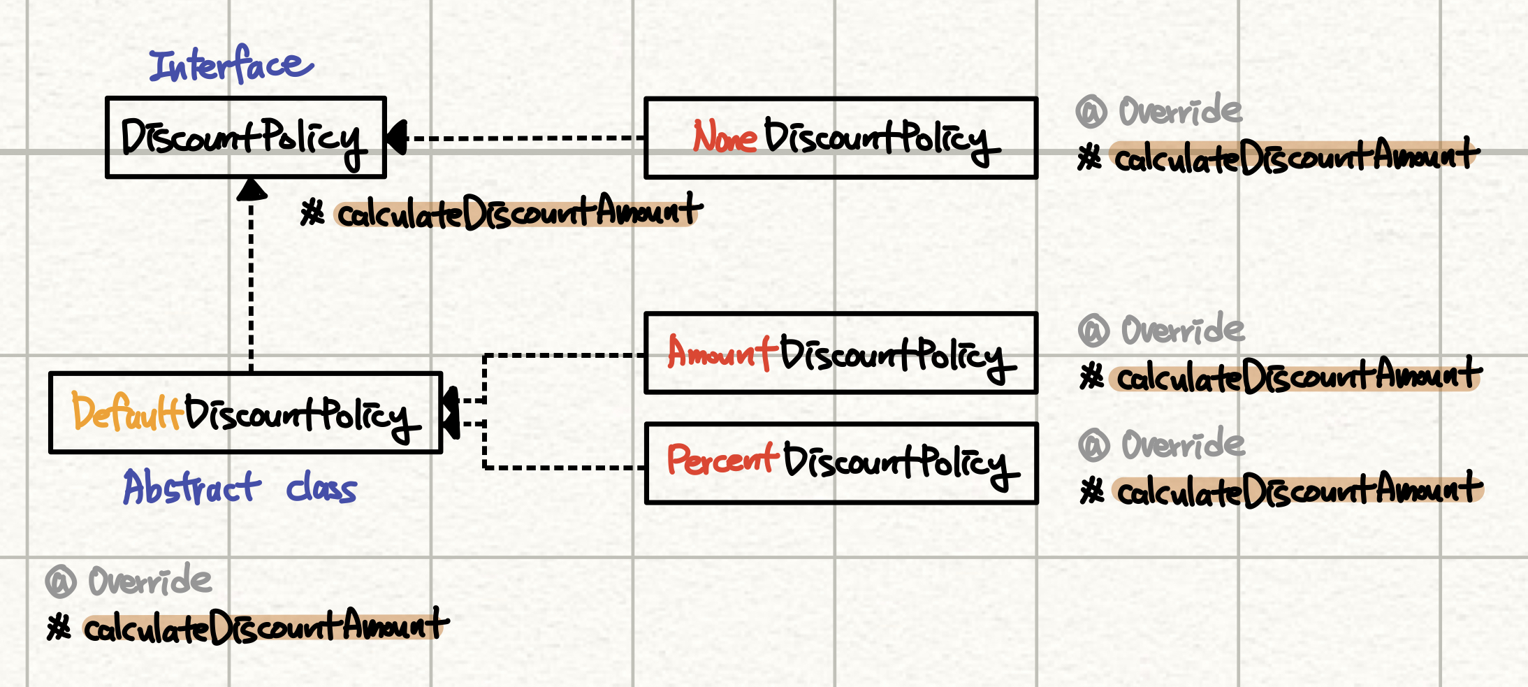 DiscountPolicy class가 Abstract class로 구현되어 있을 때, 코드의 의존성과 실행 시점의 의존성이 달라질 수 있다.