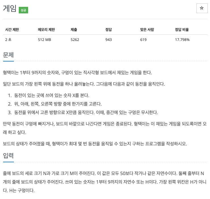 문제에따르면 최대한 보드 내에서 많이 움직여야하는데 보드바깥으로 나가거나 H를 만나면 종료되므로 해당조건으로 설계하면 이부분은 간단하다.
